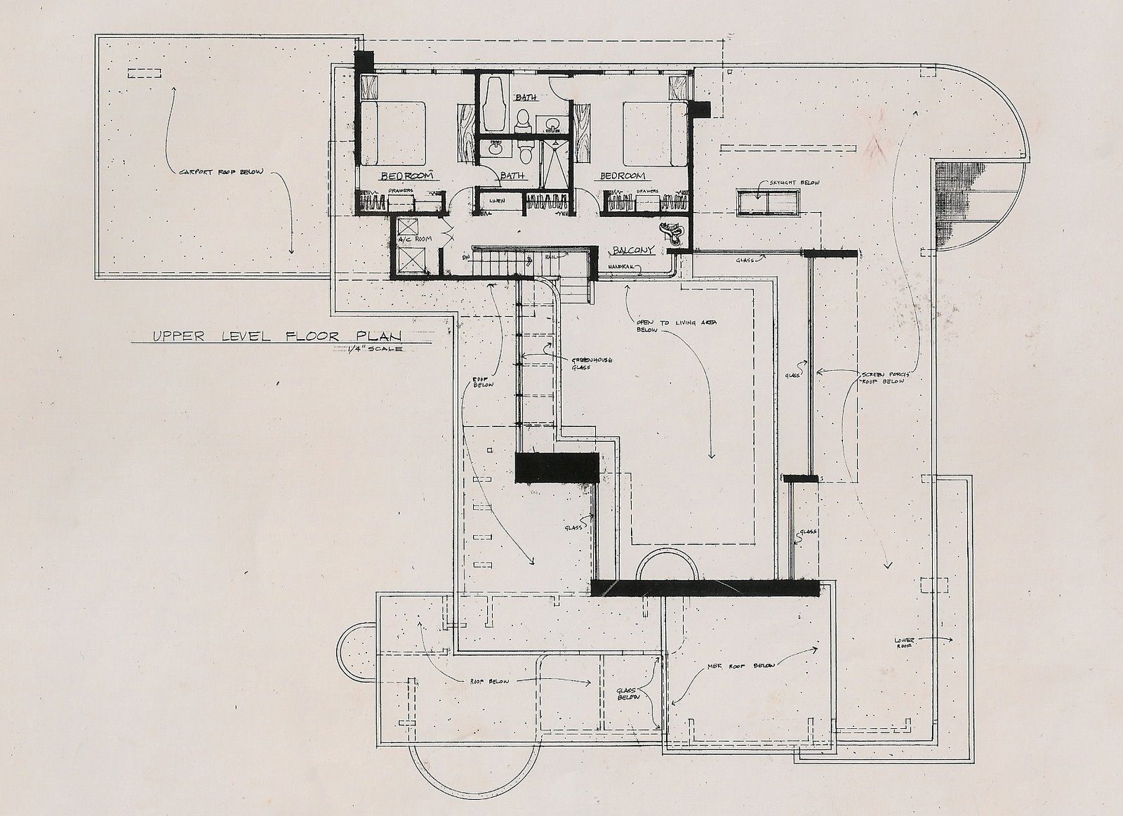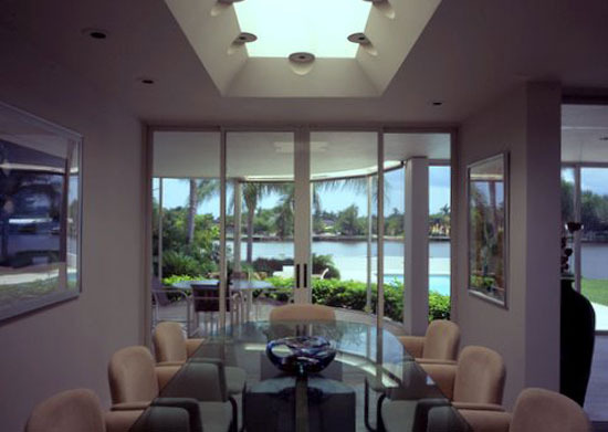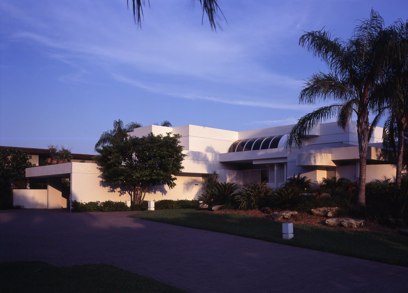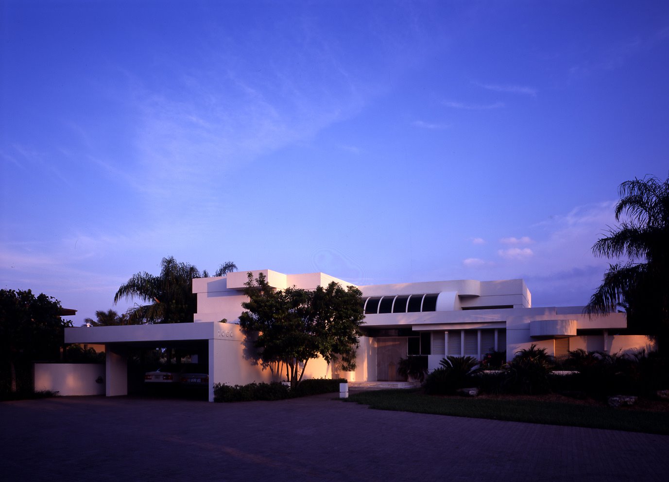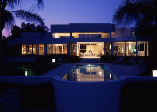two story light filled space, flanked on one side by the master bedroom suite and on the other by the dining room, kitchen and service areas. A media room is tucked into one corner of the living room, up four steps and under a lower ceiling, creating an intimate area for TV, reading and listening to music. A long covered screened terrace orients all spaces to the swimming pool and to the lake view beyond. Two guest bedrooms are hidden on the second floor.