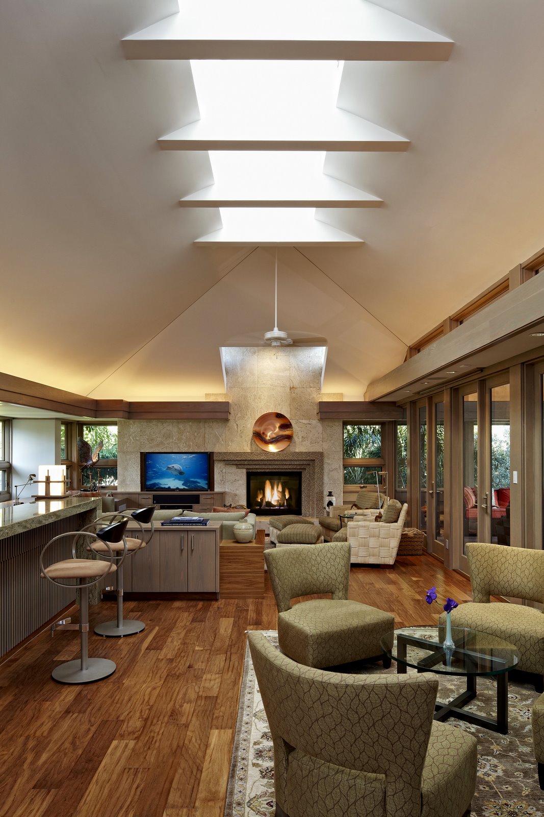 The exterior walls are split face concrete block and the upper level walls are horizontal lapped Cedar siding. Interior ceilings follow the exterior roof shapes and are surrounded by soffit/light coves. The clients were not fond of air conditioning so all rooms have ceiling fans, and when all the doors are opened to the screened porch which is the southeast corner it becomes as one big breezy space.