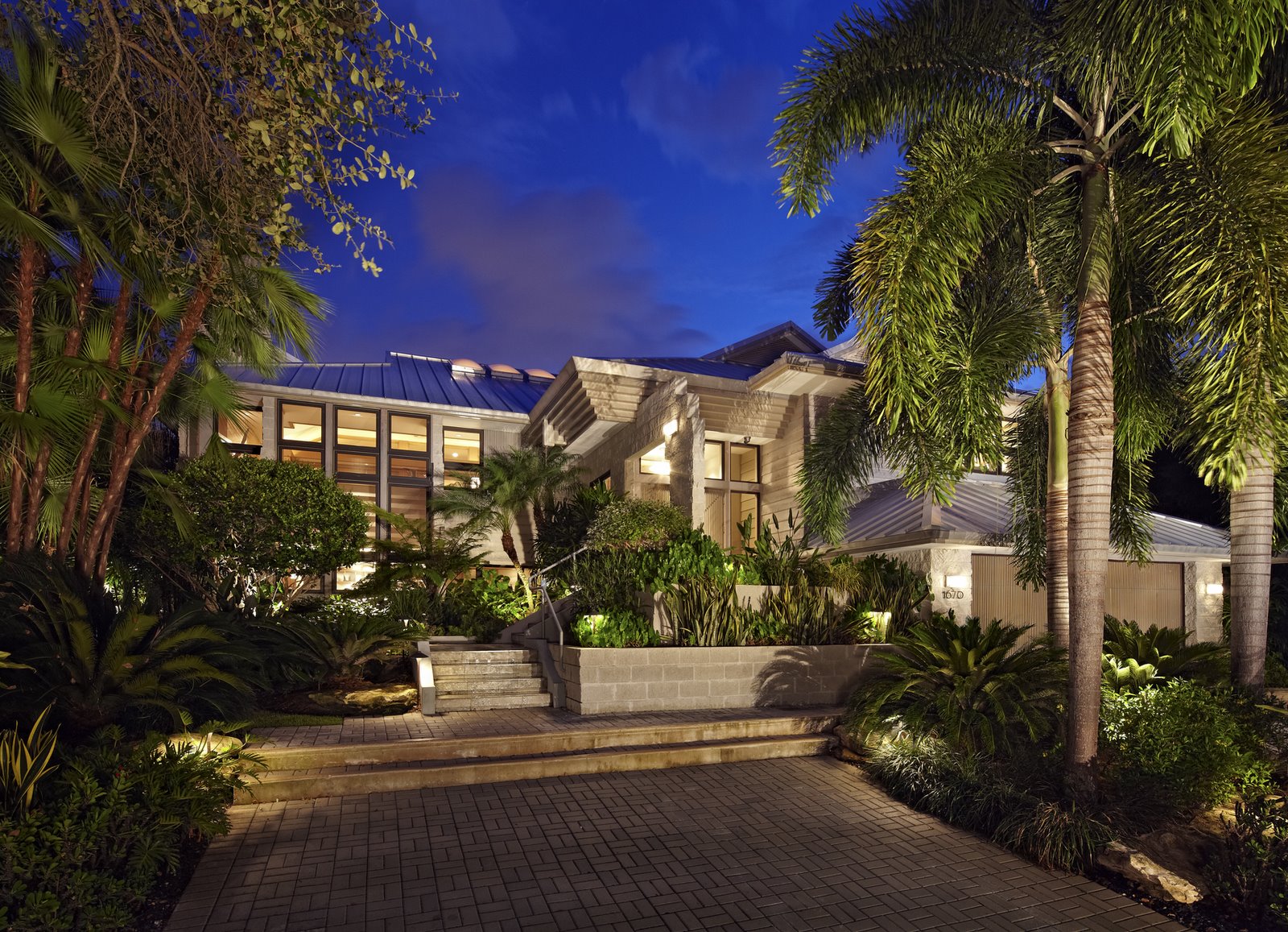 Landscaping is intentionally full and tropical for shading and privacy.