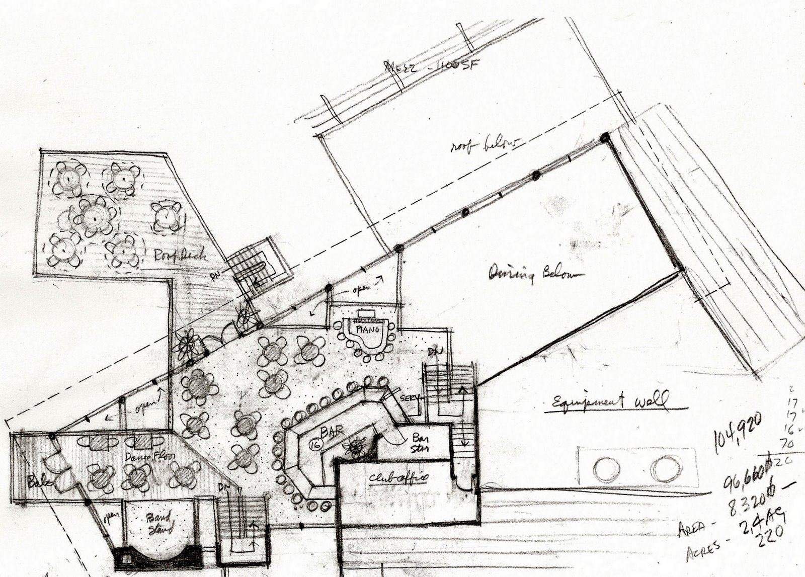 The building was a two story space with a balcony above that meandered thru the main structure on a 45 degree angle. The main bar was on the balcony and another bar was outside on a large deck.