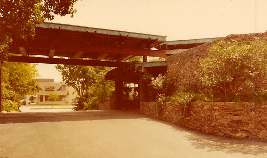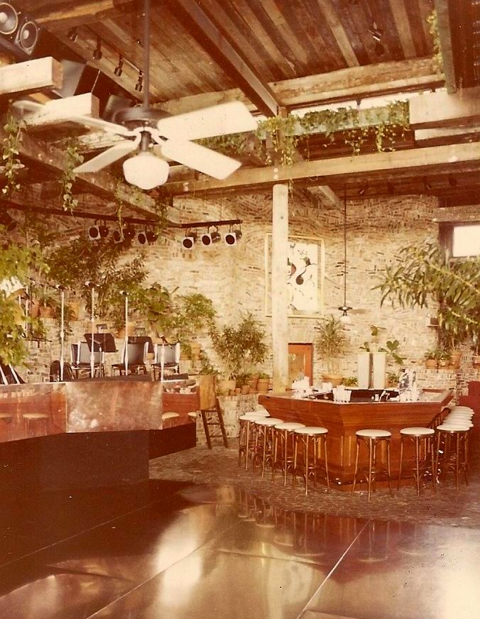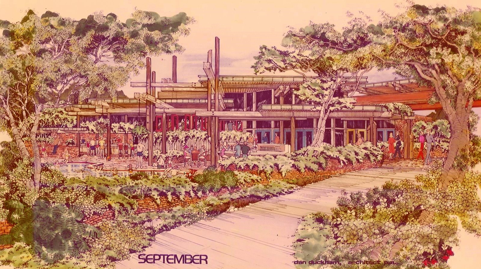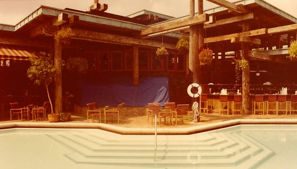 Exterior walls were used brick, inside and out with reinforced concrete within. The seven different roof levels had green copper fascias inside and out. A swimming pool and two of the six bars were integrated into the front of the meandering structure. Café September, a small gourmet dining room was added a year after opening.