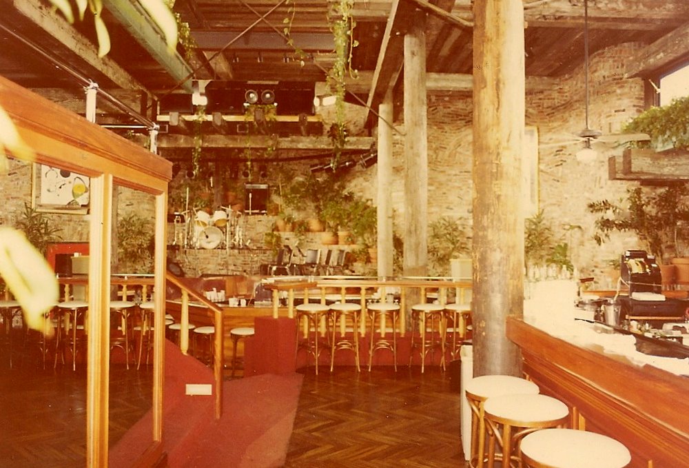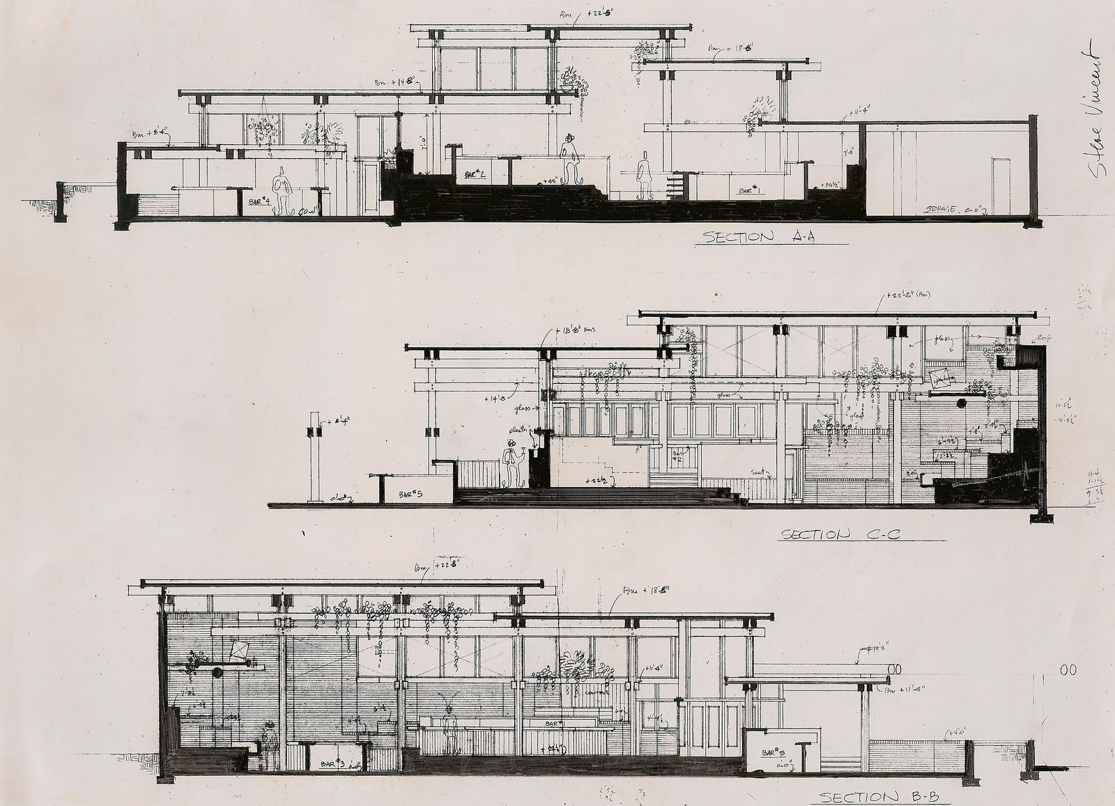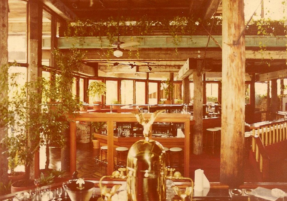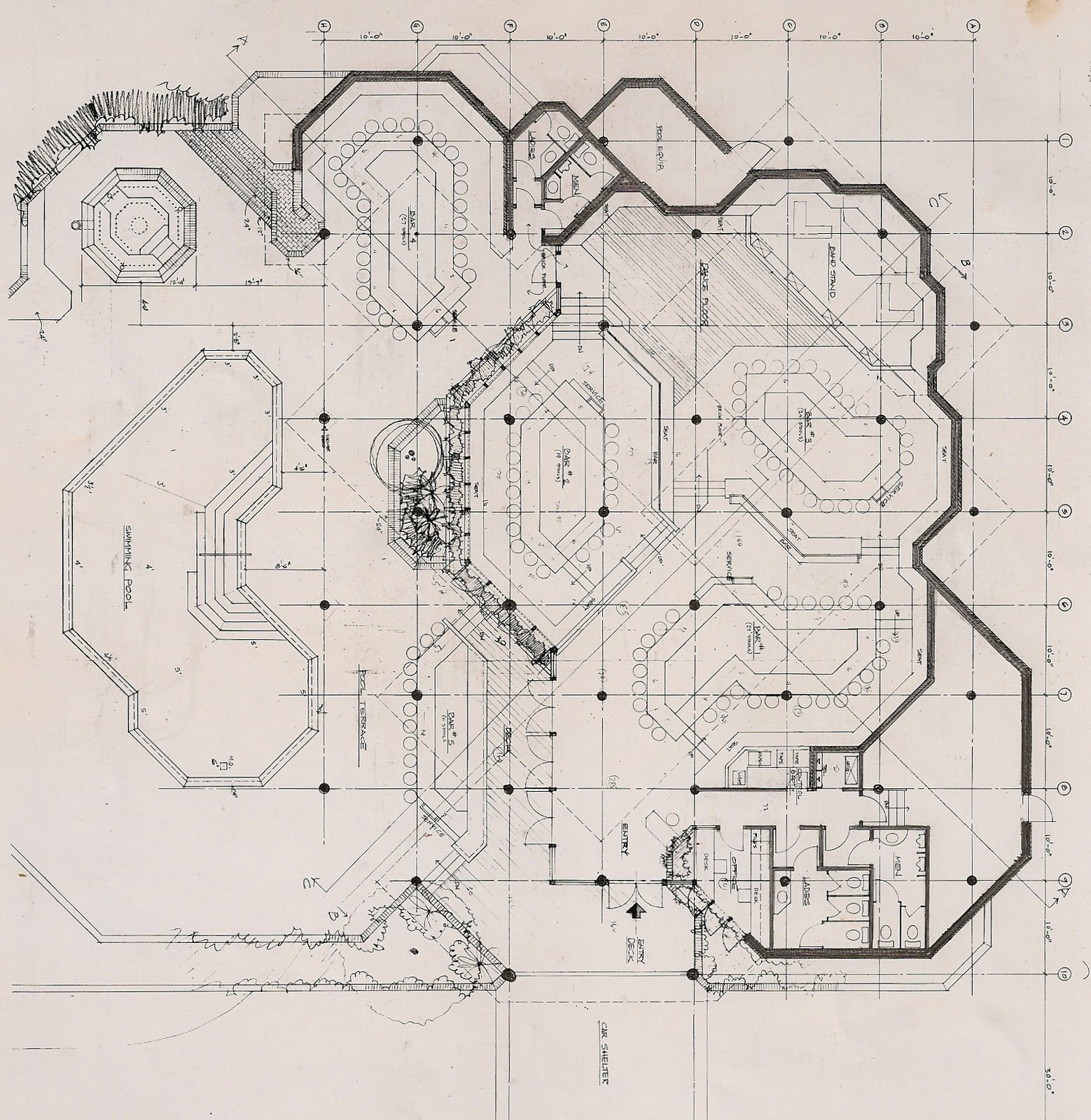 Exterior walls were used brick, inside and out with reinforced concrete within. The seven different roof levels had green copper fascias inside and out. A swimming pool and two of the six bars were integrated into the front of the meandering structure. Café September, a small gourmet dining room was added a year after opening.