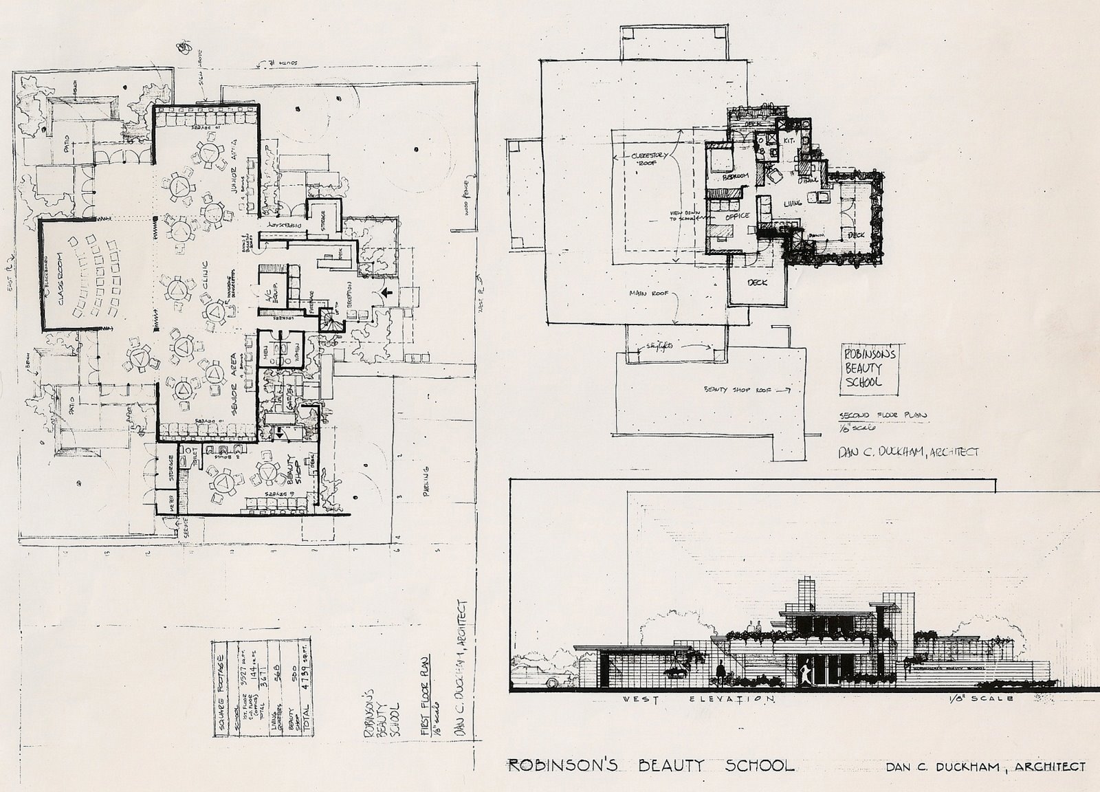 As a school for teaching hair styling, the simple open plan provided flexible space for a classroom and clinic area for multiple student styling stations. Central to this open space was a raised roof with a clerestory of glass bringing daylight into the space. Twenty hair dryers were built-in at far ends of the clinic space and eight hair washing sinks were available. Two fenced terraces were just outside for break time, and there was a separate professional beauty shop included. On the second floor, overlooking the classroom/clinic space below was the owner's private office and apartment.