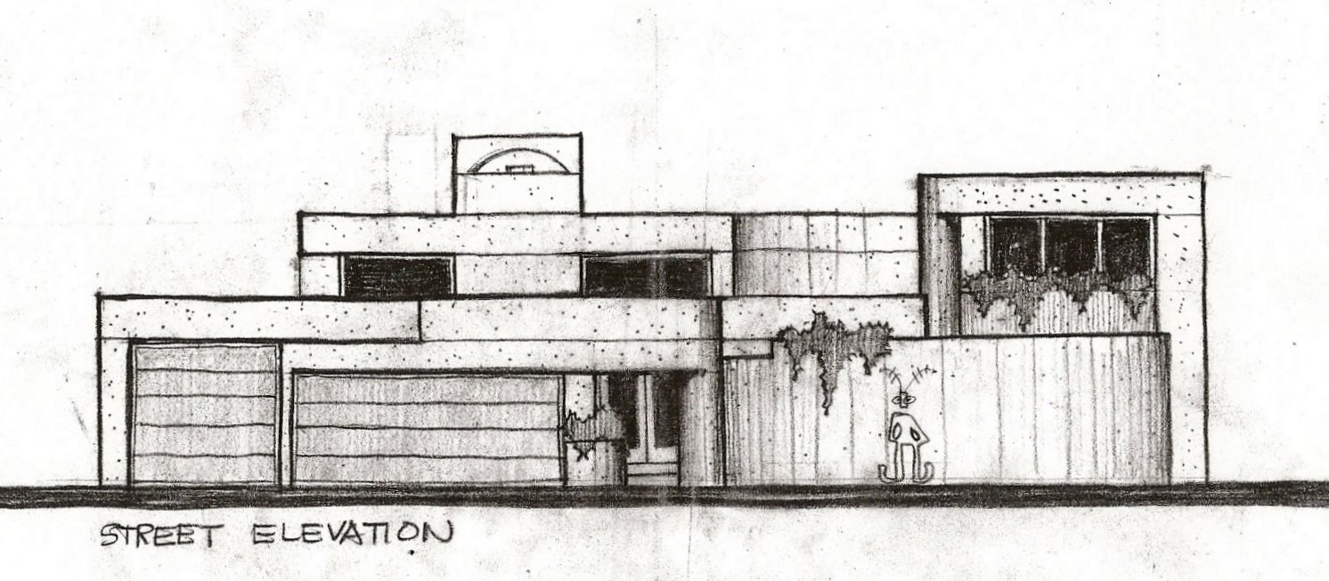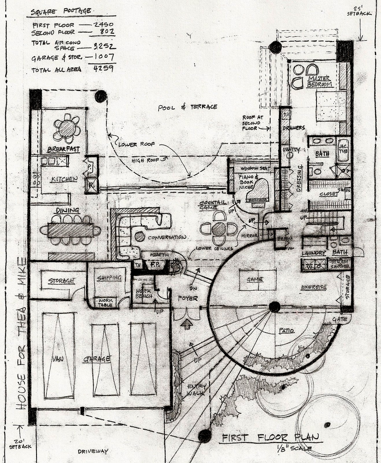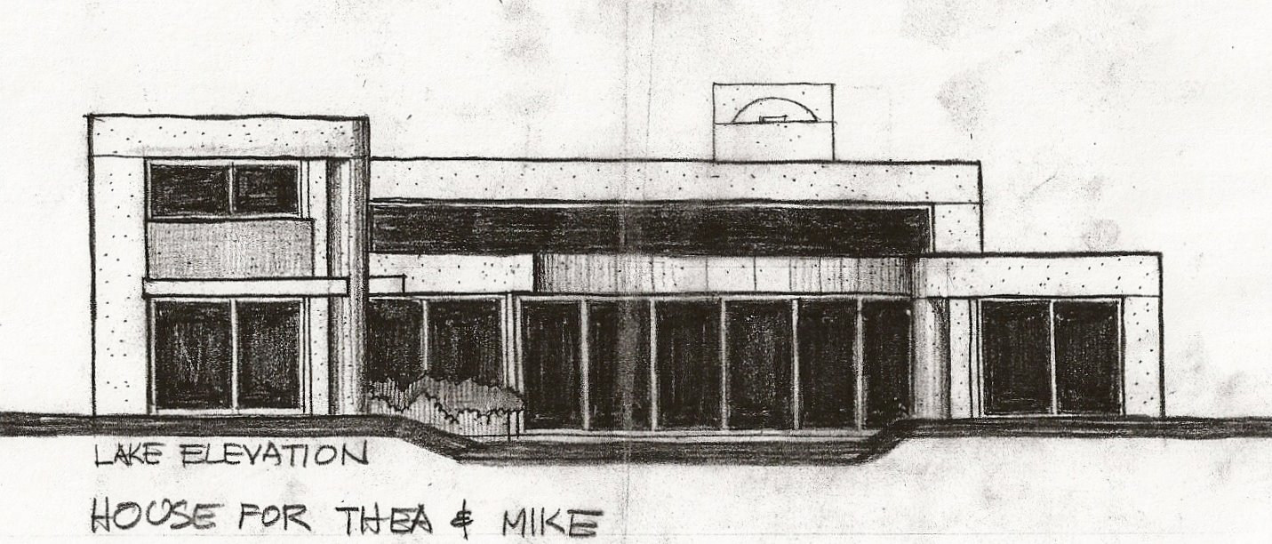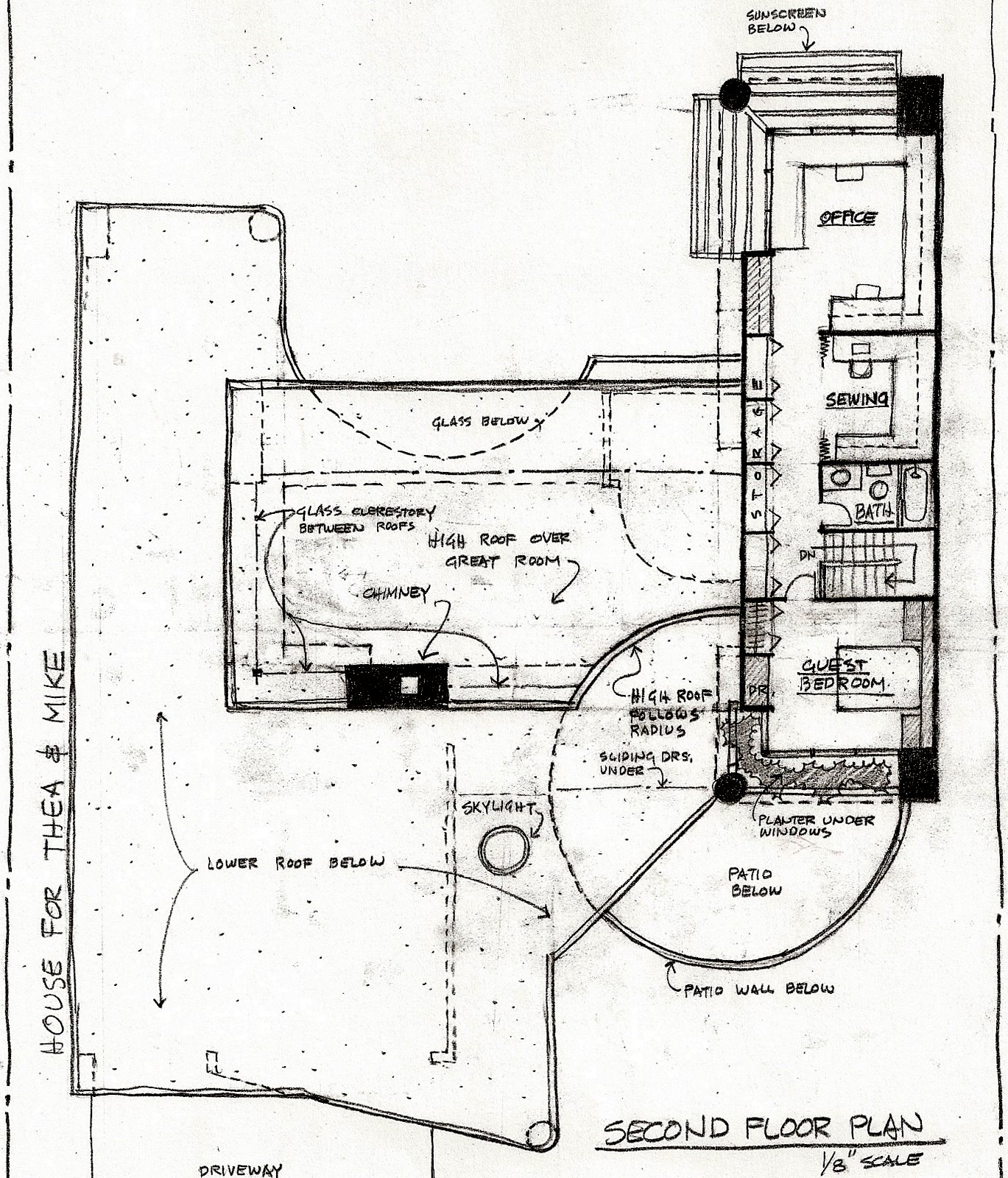 The client was an author of a best selling book and had a newsletter following, requiring an office, a shipping area and garage space for a van. The site was a golf course lot in Phoenix, Arizona. The exterior was all stucco, pueblo style……never got past the sketch.