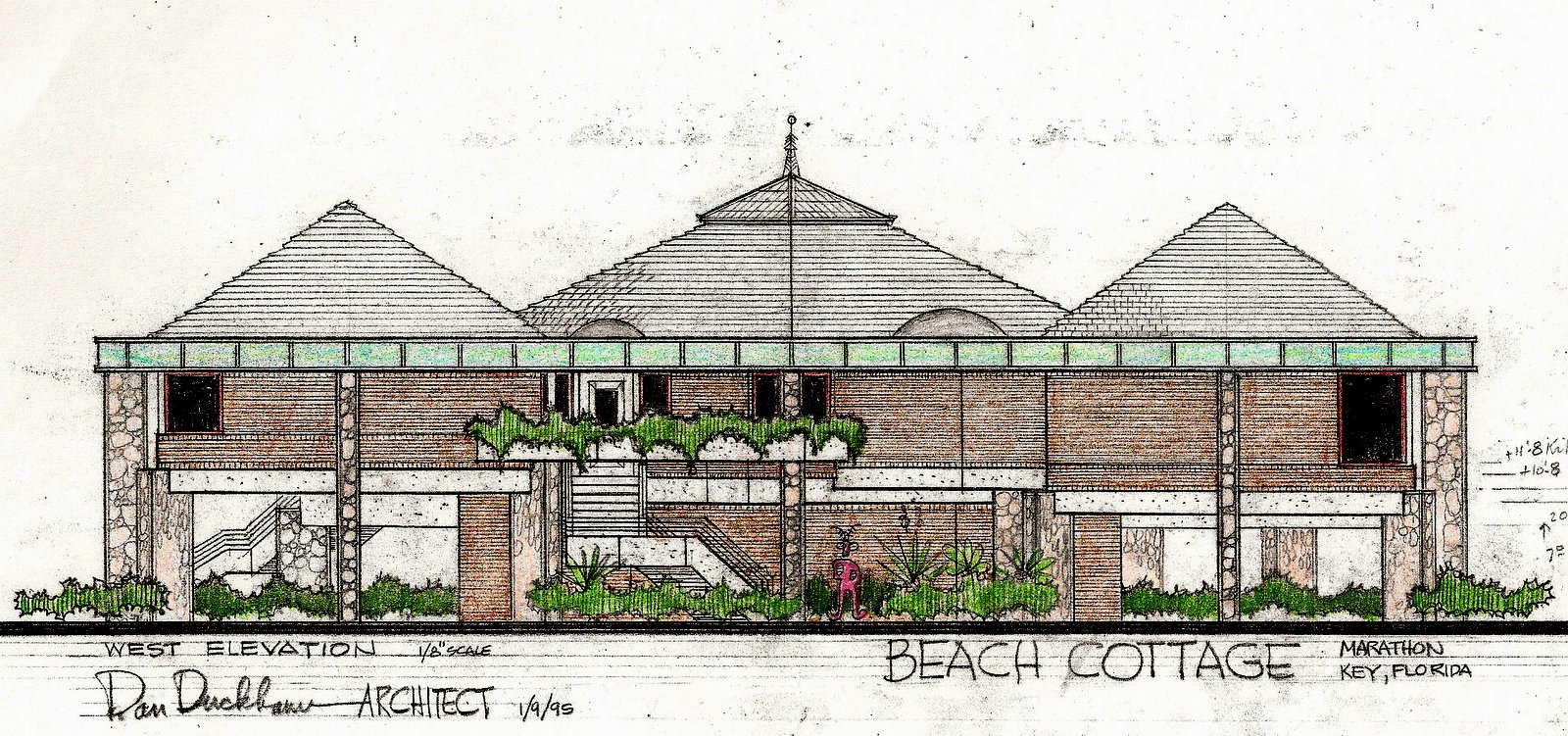 Materials were to be saw cut Coral stone, brown brick, raw board formed concrete and blue/green patina copper fascias. Another favorite unbuilt project.