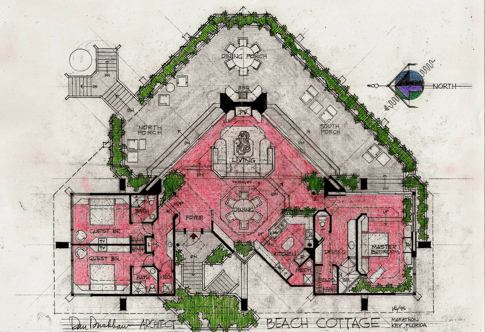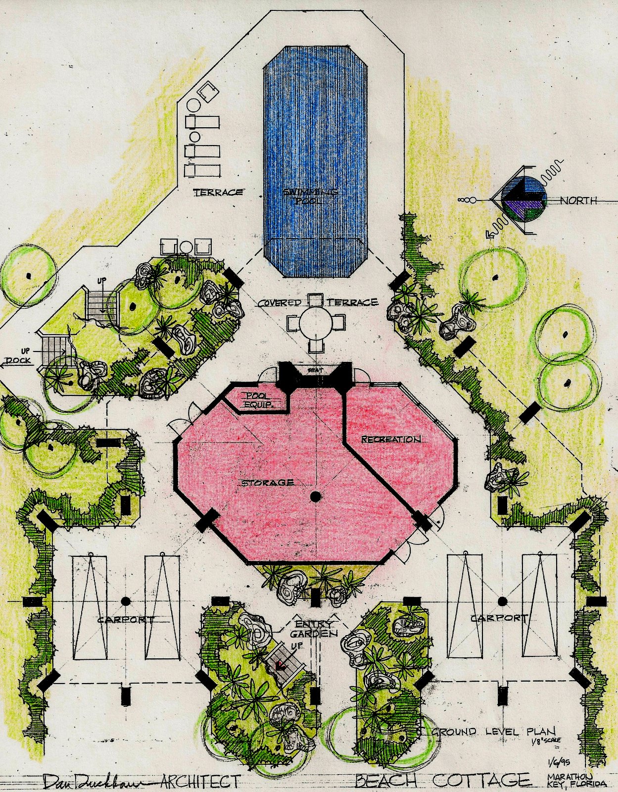 The main living areas were raised above flood tide level as required by the Keys building codes. The floor plan was basically symetrical with three bedrooms to the north and south under hip roofs and the living, dining, kitchen and foyer in between on a 45 degree angle, under a larger hip roof. Sliding doors opened to a wide "L" shaped terrace and were pocketed out of sight for complete openness to the ocean view.