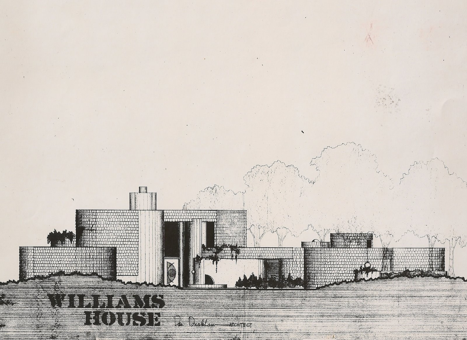 The structure was mostly wood frame clad with shingles, and a few important vertical elements that were block and stucco. A playroom for the children would sit on a tiny island close to shore, and be connected to the house with a covered screened porch forming a bridge. A second floor master bedroom overlooked the living room and entry.