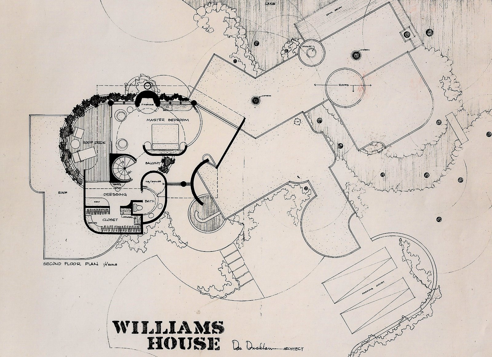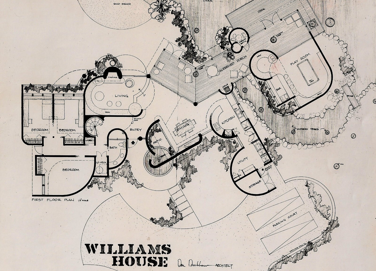 The clients were a young couple with three children. The property was in an Orange grove on the shore of a Cypress tree lined lake. They liked the curvilinear shapes and angles of several previous projects.